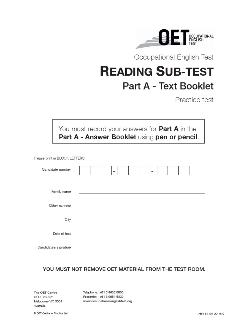 Visit the OET Shop Buy official OET preparation material for your profession including practice books an online course and a personalised feedback voucher. Practice Test 1 READING SUB-TEST QUESTION PAPER. OET Writing sub-test Answer booklet 1.